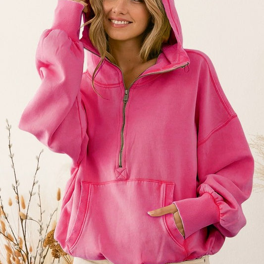 Don’t miss out on the must have hoodie of the season! This stitch detailed elastic hem hoodie comes in the absolute perfect shades of fuchsia and lemon. The half zip design allows for easy wear and layering, while the hood adds a casual and relaxed vibe. Whether you’re running errands or lounging at home, this top is perfect for staying comfortable and chic. Pair it with your favorite leggings or jeans for a laid-back yet trendy look that will keep you feeling warm and stylish all day long.
