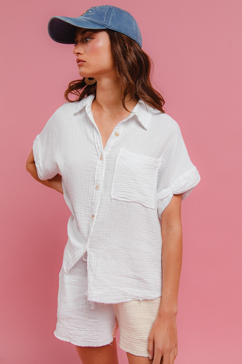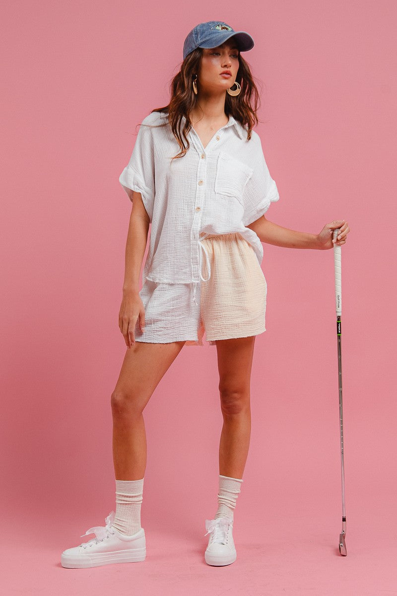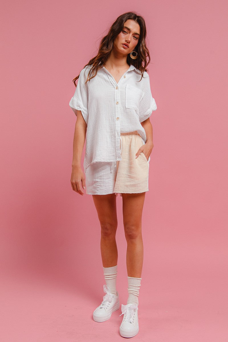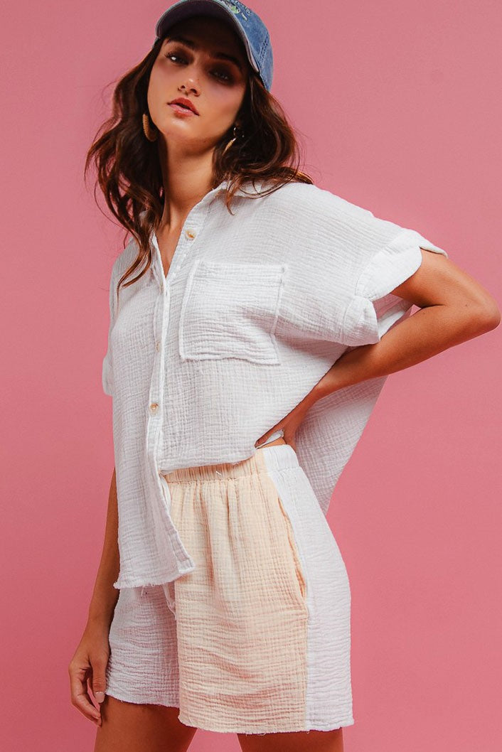 BiBi Wrinkled Gauze Solid Shirts Top and Shorts Set