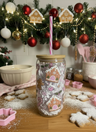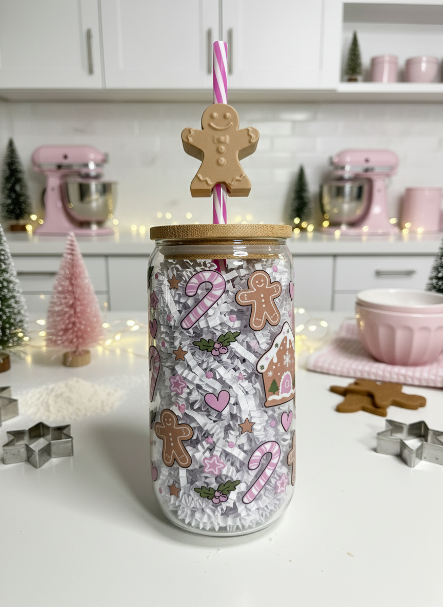 Gingerbread Christmas Glass Can & Straw Topper w/ extra straw - 16oz.