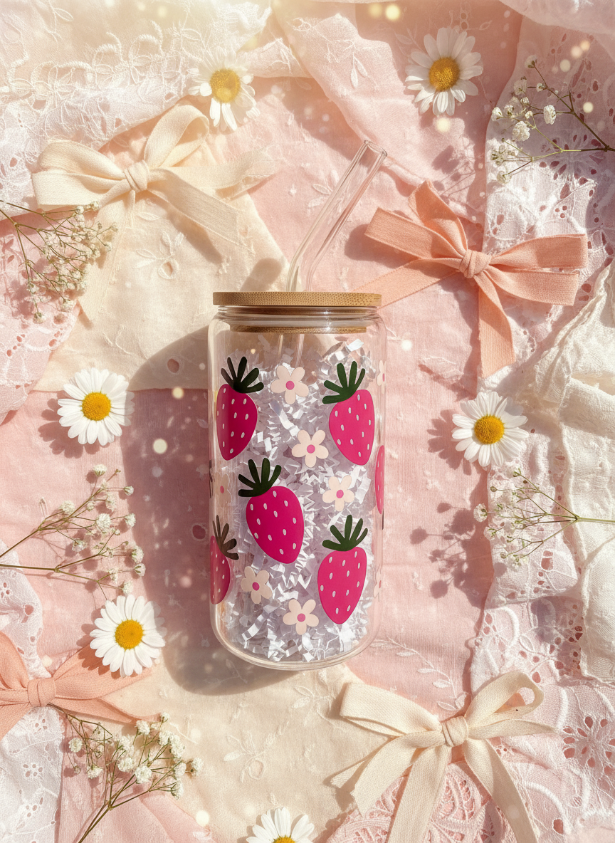Pink Strawberries Glass Can - 16oz.
