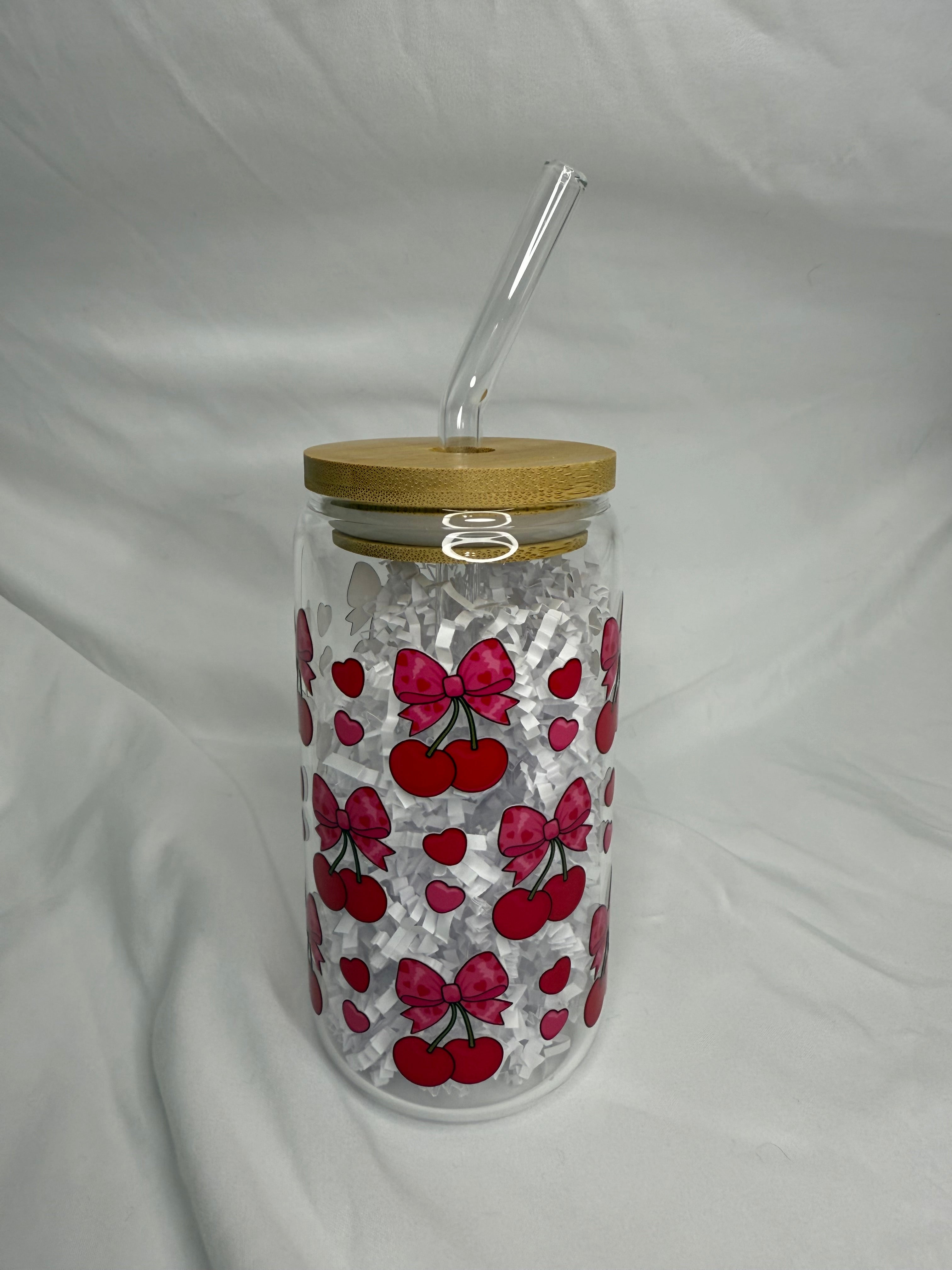 16oz. Glass can cup w/ bamboo lid & glass straw.
