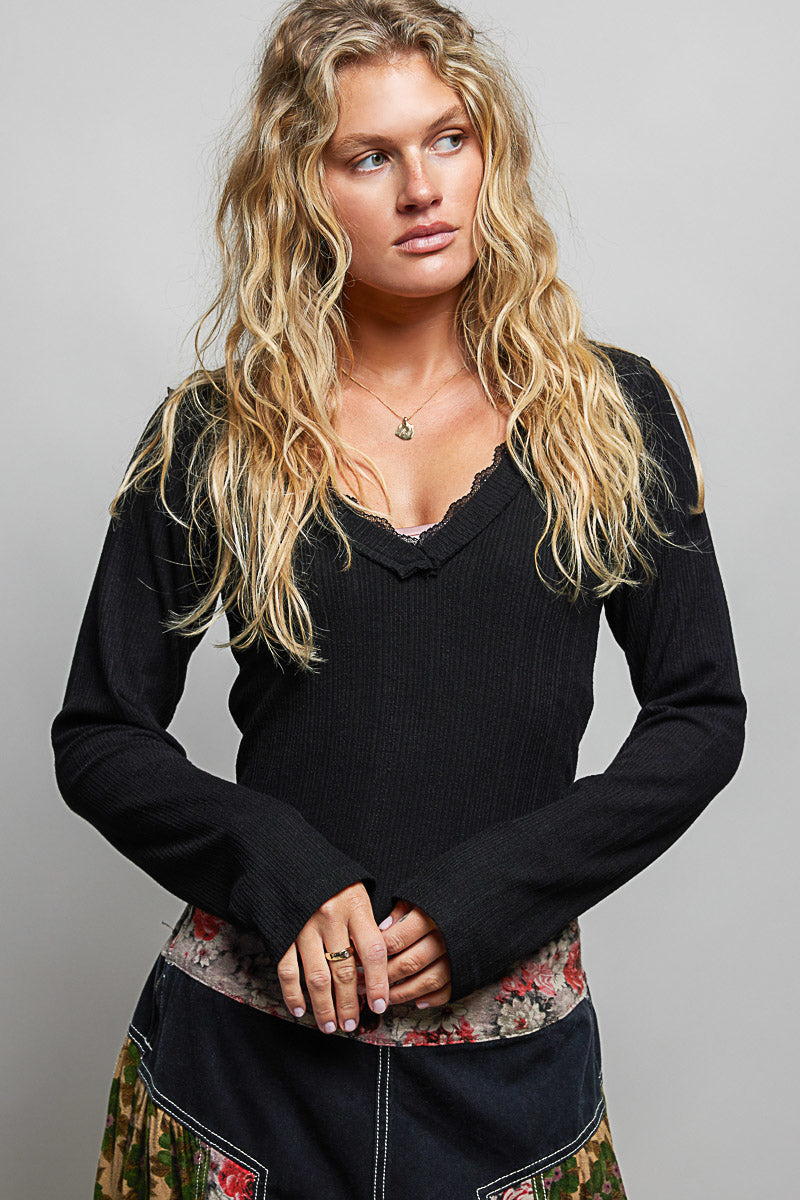 POL V-Neck Long Sleeve Ribbed Top with Lace-Accent Neckband